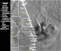 Eastern Florida Visible Satellite @ 2:54 PM EDT 9/4 - Incredible detail of the eye of the storm is shown on this high-resolution satellite image of eastern Florida, which shows the latest weather observations from airports.   Eastern Florida Visible Satellite @ 8:30 PM EDT 9/4 - As the sun sets, the wide eyewall makes landfall between Palm Beach and Port Saint Lucie, Florida.
