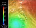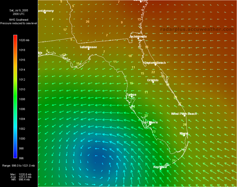 Florida Satellite, Pressure, Winds 10:00 AM ET 7/9 - This beautiful shot of Dennis passing by the Florida Keys shows an Infrared Satellite behind a pressure analysis gradient and wind analysis arrows.   Florida Satellite, Winds, Radar 10:35 AM ET 7/9 - Radar on top of visible satellite, with wind analysis arrows, shows the eye of Dennis as it moves into the Gulf.