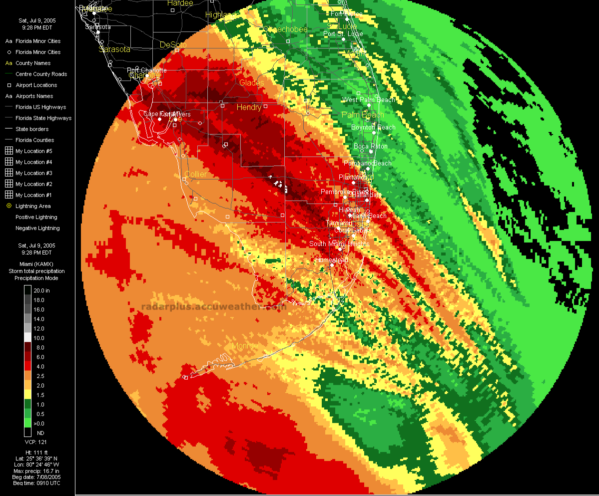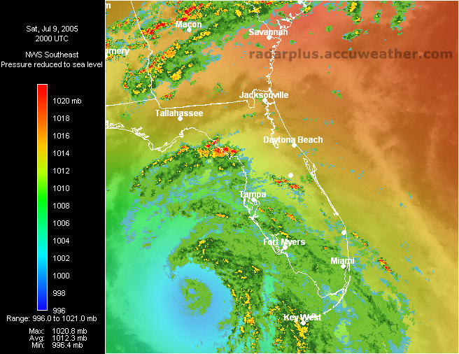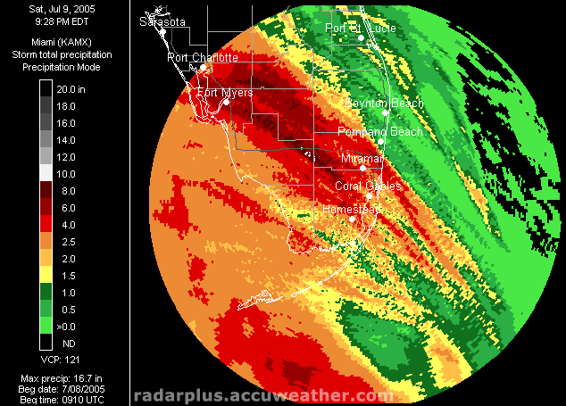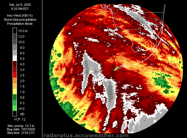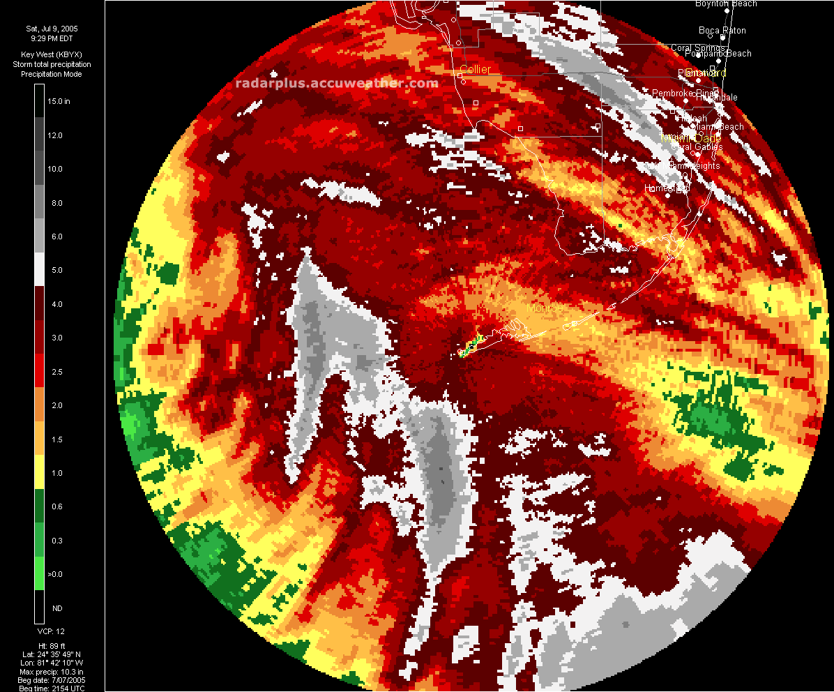 Florida Pressure, Radar, Satellite 5:00 PM ET 7/9 - In this shot, we have turned off the wind arrows and added the radar on top of the pressure gradient, over an Infrared satellite, clearly showing the eye of Dennis over the Gulf.   South Florida Saturday Rainfall Totals - (LOW-RES | HI-RES) - Here we see that over 10 inches of rain fell over the Gulf from Hurricane Dennis, according to Doppler-Estimated precipitation from the Key West radar.