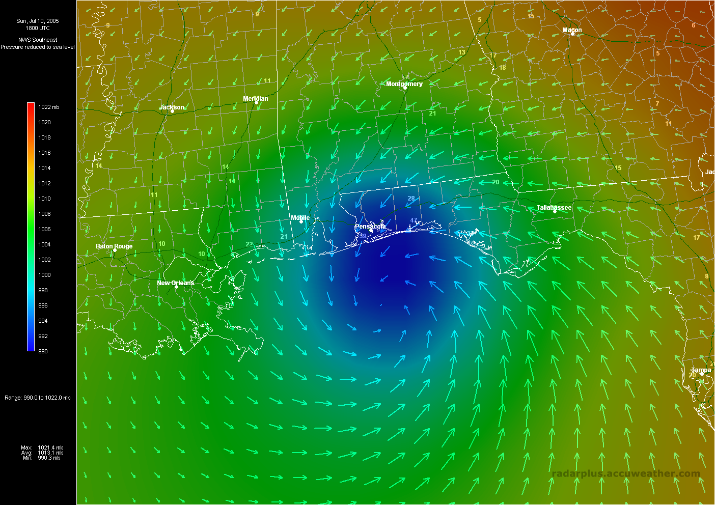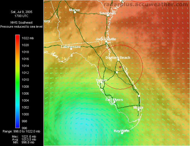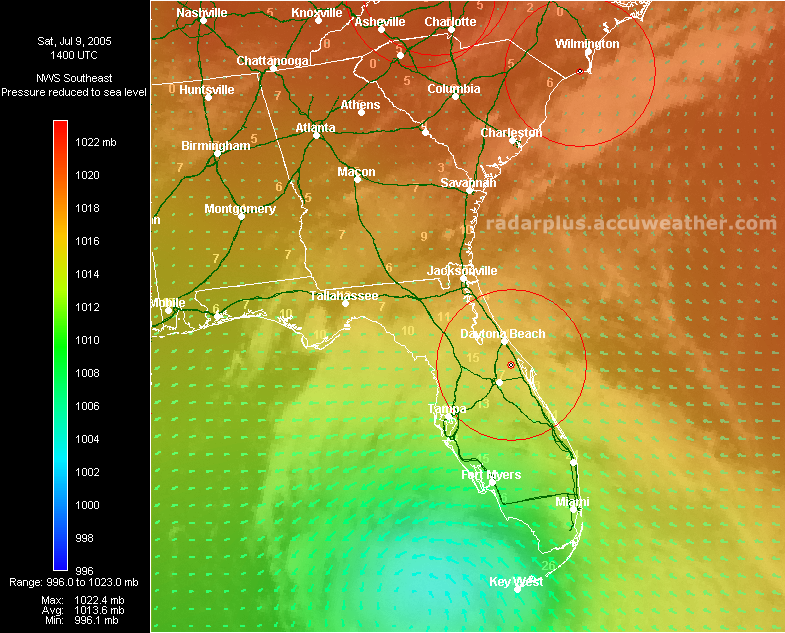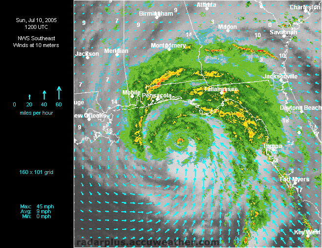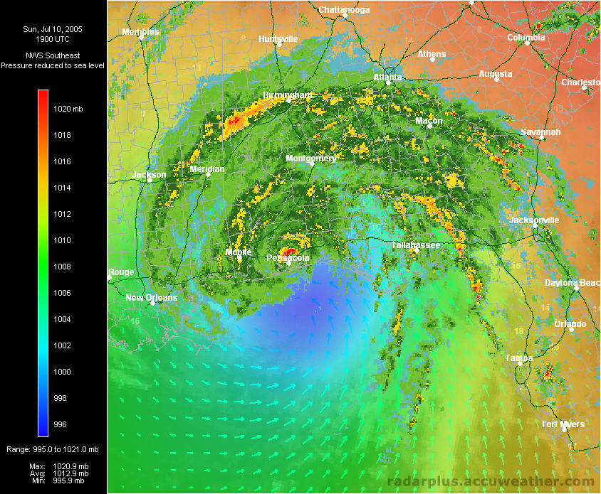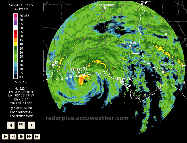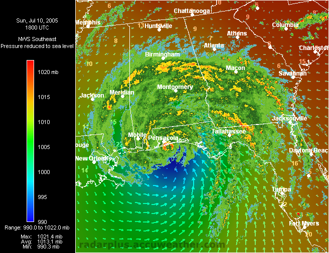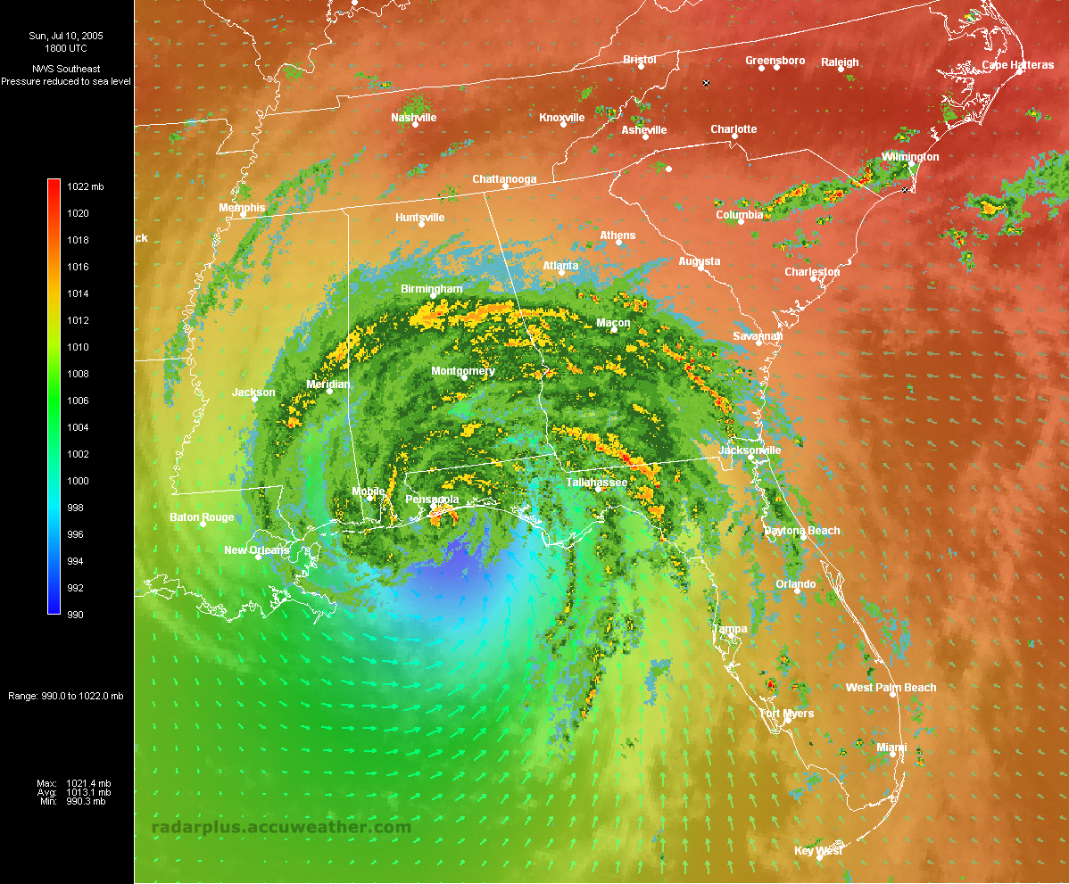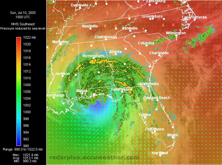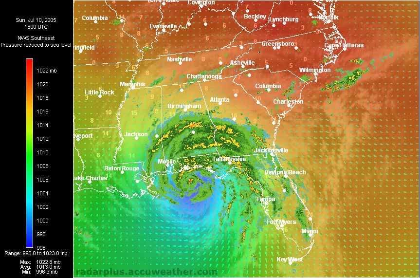 Florida Pressure, Winds, Radar 3:00 PM ET 7/10 - Dennis makes landfall just east of Pensacola, Florida. Radar on top of visible satellite, with wind analysis arrows, shows the eye of Dennis as it moves on shore. Again, notice the unusual lack of rainfall south of the storm, which would keep many areas from a flooding disaster.   Southeast Radar, Satellite, Winds, Pressure 3:00 PM ET 7/10 - (LOW-RES | HI-RES) Hurricane Dennis makes landfall east of Pensacola, Florida Sunday afternoon. During Dennis, RadarPlus users could toggle any or all weather and geographical layers while zooming and panning maps of the Southeast or Florida.