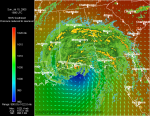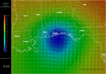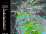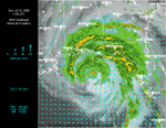 Florida Satellite, Winds, Radar 8:00 AM ET 7/10 - Dennis makes landfall just east of Pensacola, Florida. Radar on top of visible satellite, with wind analysis arrows, shows the eye of Dennis as it moves on shore. Notice the interesting lack of rainfall in the southern part of the storm, which would lead residents to believe they never got out of the eye!   Southeast Satellite, Pressure, Winds, and Radar 1:00 PM ET 7/10 - This beautiful shot of Dennis approaching the Florida coastline shows an Infrared Satellite behind a pressure analysis gradient and wind analysis arrows, with radar on top.