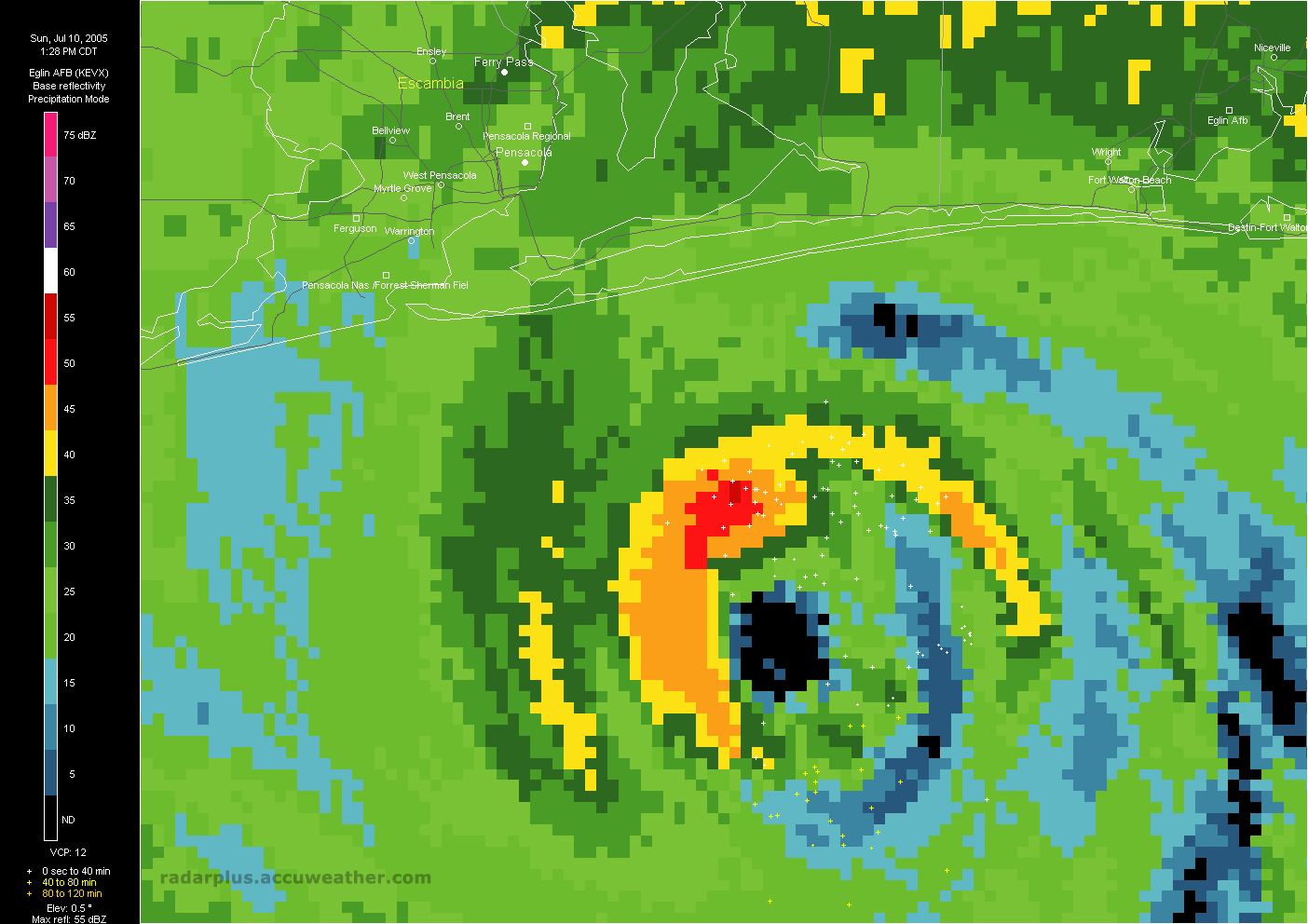 Pensacola Radar, Lightning Strikes 1:56 PM ET 7/10 - (LOW-RES | HI-RES) As Dennis approaches Pensacola, this radar image from RadarPlus shows unusual lightning strikes in the eyewall (white strikes are 0-40 minutes old). Hurricanes do not typically contain lightning when offshore. Surface plots from land stations are also shown in this image.   Escambia/Santa Rosa County Radar, Lightning Strikes 2:28 PM ET 7/10 - (HI-RES) The eyewall of Hurricane Dennis is now moments away from landfall. Additional lightning strikes are still occurring within the eyewall. Hurricane Andrew in 1991 had no more than 10 lightning strikes per hour, and some hours with no lightning, during its approach to Florida.