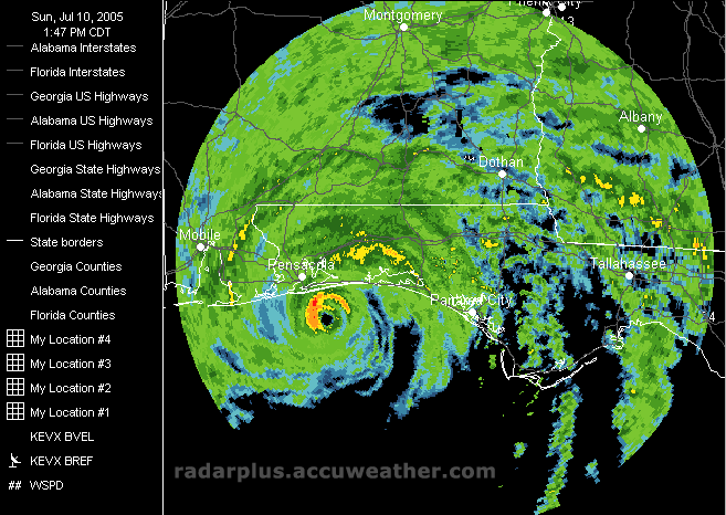 Florida Pressure, Winds 2:00 ET PM 7/10 - (HI-RES)As Dennis prepares to make landfall Sunday afternoon, RadarPlus shows a high resolution pressure and wind analysis in the Florida Panhandle. Sustained wind reports are plotted on the map, and Interstates and county borders are shown.   Escambia/Santa Rosa County Radar 2:28 PM ET 7/10 - (HI-RES)This closeup zoom of the Eglin AFB Radar Composite Reflectivity in RadarPlus shows the eyewall of Hurricane Dennis over the streets and county roads in Escambia and Santa Rosa counties at 3:02 PM ET.