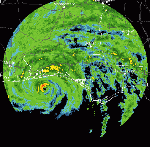 Escambia/Santa Rosa County Radar MOVIE - 7/10 This zoomed view of the Eglin AFB Radar uses Composite Refletivity radar data to show the worst of the storm at all levels of the atmosphere. It shows extremely heavy rain in the outer eyewall.   Escambia/Santa Rosa County Radar MOVIE - 7/10 This "hyperzoomed" version of the Eglin AFB Composite Refletivity Radar shows streets and county roads in Santa Rosa and Escambia counties as Hurricane Dennis makes landfall and spreads heavy rain across the counties.