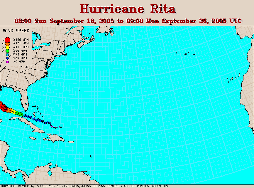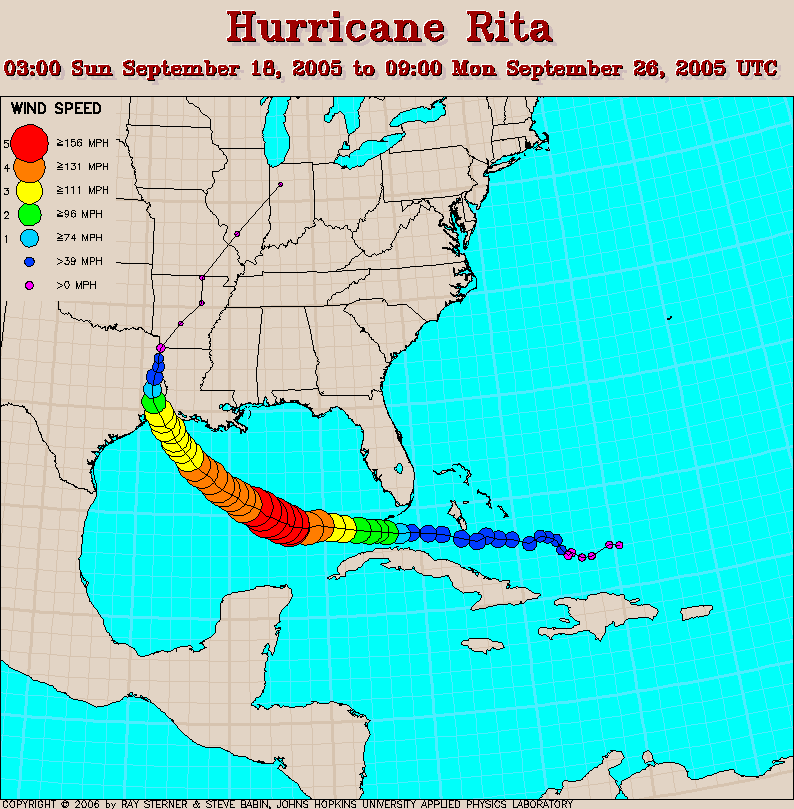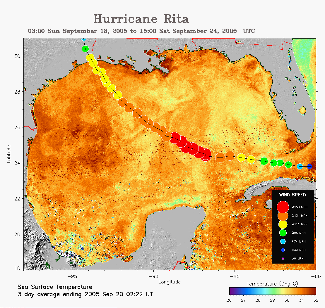 to 32C. The track of Rita is overlaid on this image.